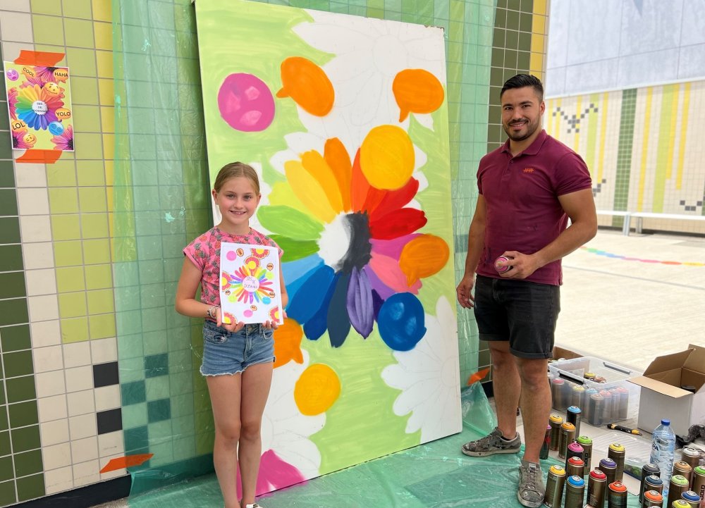 Vandaag vond dit plaats in SBS De Doening waar graffitikunstenaar Nihan Yilmaz naar het ontwerp van leerling Nina (4de leerjaar) haar tekening reconstrueert in aanwezigheid van schepen van onderwijs Jo De Ro en schepen van cultuur Moad El Boudaati. Zij onderschrijven het belang van cultuur via school in de ontplooiing van onze jongeren. En de rol van schoolvoorstellingen om hen te laten proeven van live cultuur en podiumkunsten.