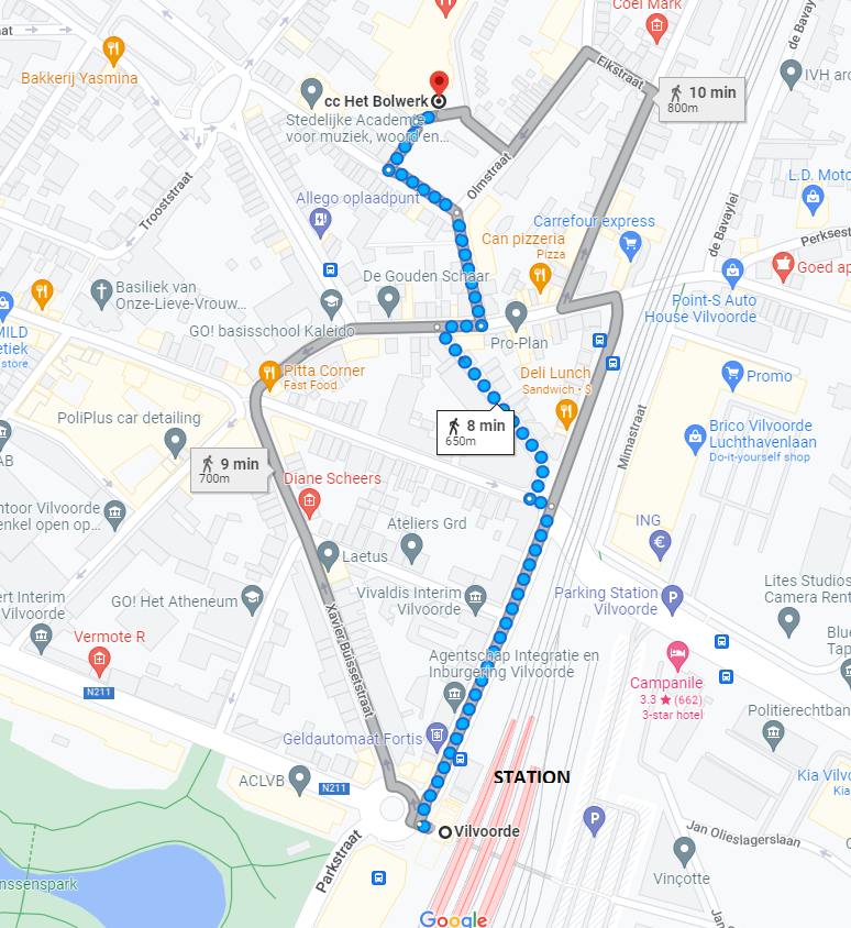 Er zijn verschillende routes om van het station naar cc Het Bolwerk te wandelen. De kortste is via de Benoit Hanssenslaan: