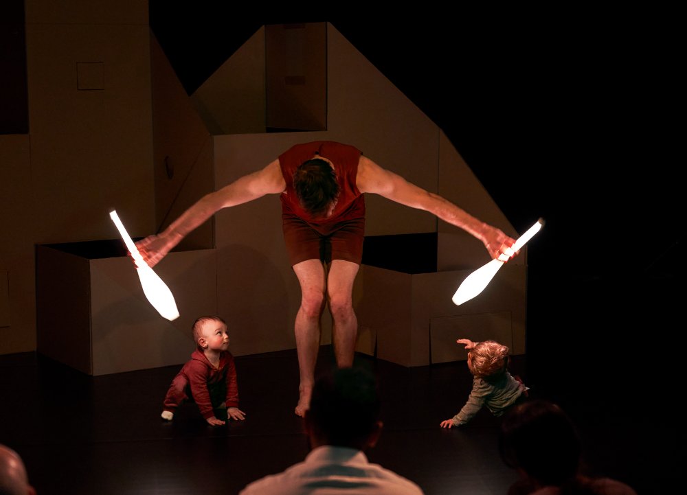 In deze voorstelling vol kleur en beweging nemen twee circusartiesten jullie mee op een zintuiglijke reis. Van het gezang van vroege vogels tot lichtgevende jongleerkegels in de schemering, volgens het ritme van de dag. Het pop-updecor komt langzaam tot leven. Er is altijd wel iets dat rammelt, verschijnt, kraakt, rolt of zweeft. Tijdens de voorstelling ontstaat een hartverwarmende dialoog tussen de artiesten en hun jonge publiek. Door deze spontane interacties is elke voorstelling net iets anders.