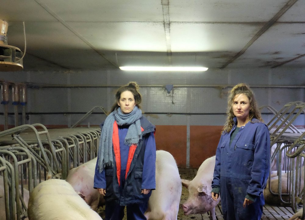 Een varkenshouderij. Twee vrouwen op de dorpel. Of staan ze met hun rug tegen de muur?