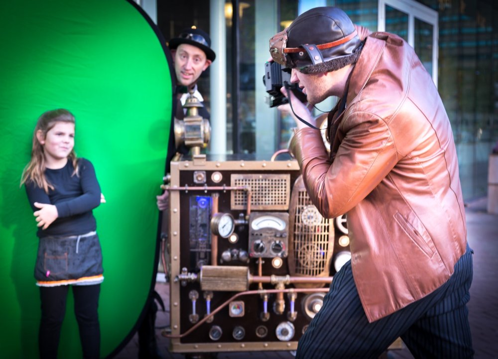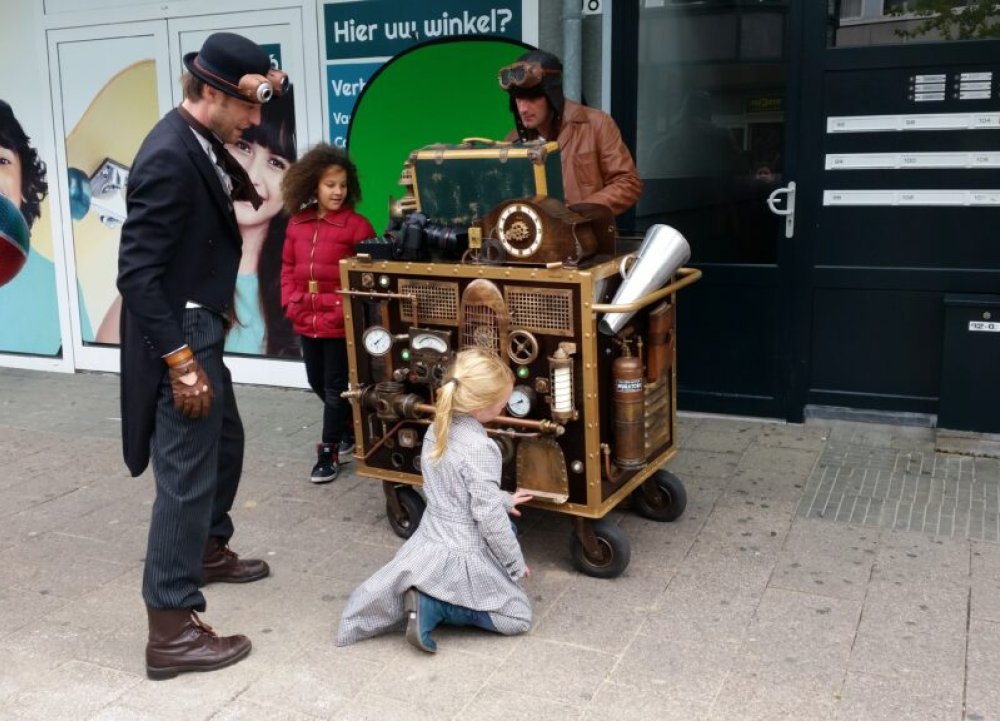 Stoom, licht- en geluidseffecten en grappig straattheater trekken de aandacht van het publiek. Al snel betrekken onze acteurs de omstanders bij deze gebeurtenis om De Machine vervolgens actief mee te beleven. Er wordt een foto gemaakt en de gasten mogen zelf De Machine met een druk op de knop aan het werk zetten om daarna een prachtige en verrassende foto-afdruk te produceren. Na veel gepiep, geknars, gebonk en gedraai aan knoppen zal de foto in een verborgen vak verschijnen. Wat een wonder van techniek!
