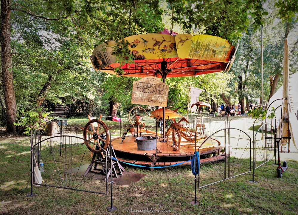 Capitein Gustav en zijn bemanning bevoeren de zeven wilde zeeën. Op hun prachtige reizen zagen zij wonderlijke zeewezens, woeste golven en verre vreemde landen. Samen met zijn onverschrokken zeelui stapt hij nu in een nieuw avontuur. Alle verhalen die de zeelui verzamelden, krijgen vorm in onze prachtige carrousel “L’Imaginarium du Capitein Gustav II”. Kruip mee aan boord en maak je klaar voor een wonderlijke reis! De diepzeeduikers, wilde watervissen, de stoere zeebonken en Capitein Gustav heten u van harte welkom! De molen werkt enkel op menselijke kracht. Laat je ouders dus maar fietsen!