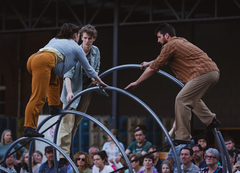 Op, in, langs en rond een metalen spiraal van maar liefst 5 meter breed en 3 meter hoog, zoeken drie acrobaten hun balans. Tussen flow en wrijving creëren ze hun eigen wereld waarin er andere wetten van zwaartekracht gelden. Een wereld waar een val eindeloos kan lijken en tijd relatief is.
