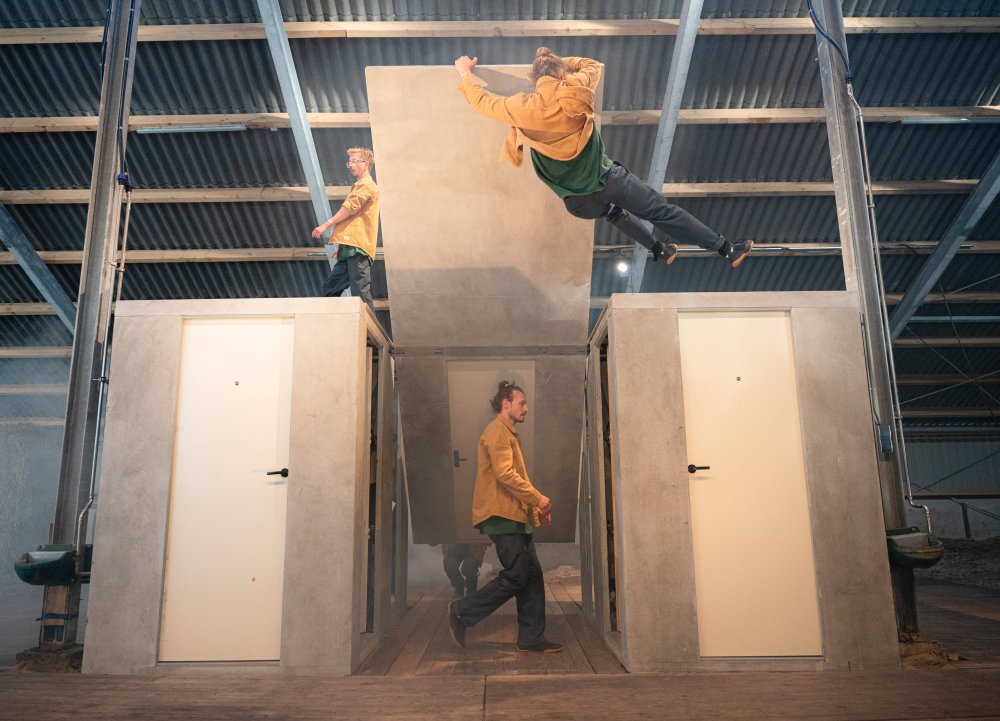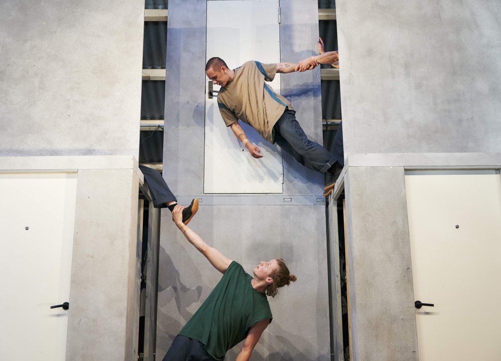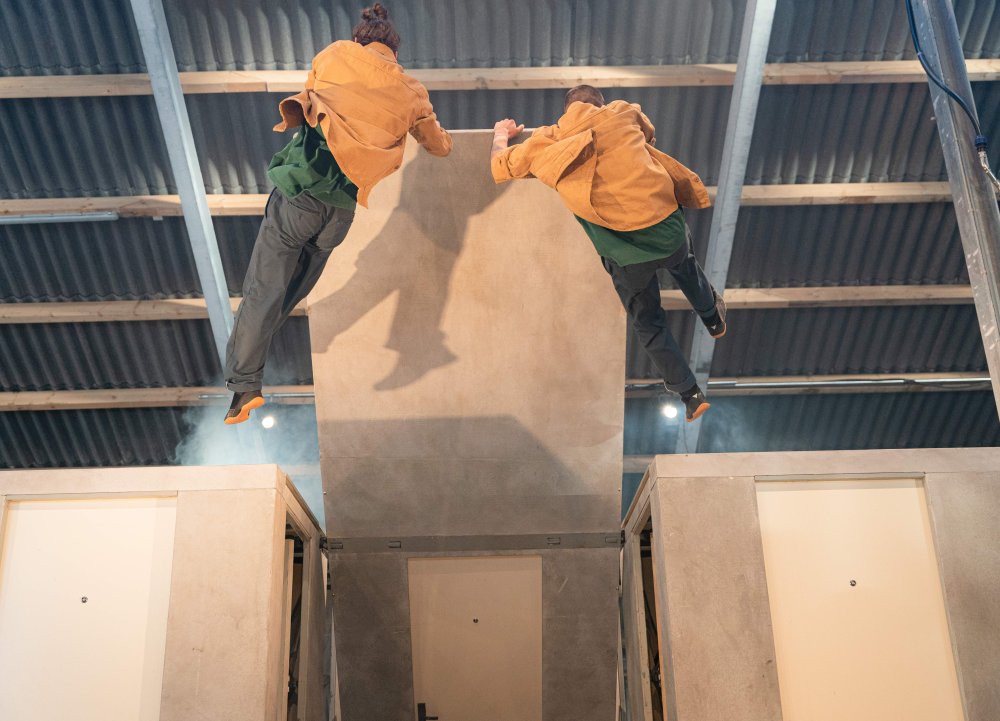 Het stuk bouwt slim op naar een adembenemende apotheose. De performers hijsen zich de lucht in, glijden van de muur en zoeken met z’n vieren een balans die ze uiteindelijk ook vinden. Indrukwekkend.